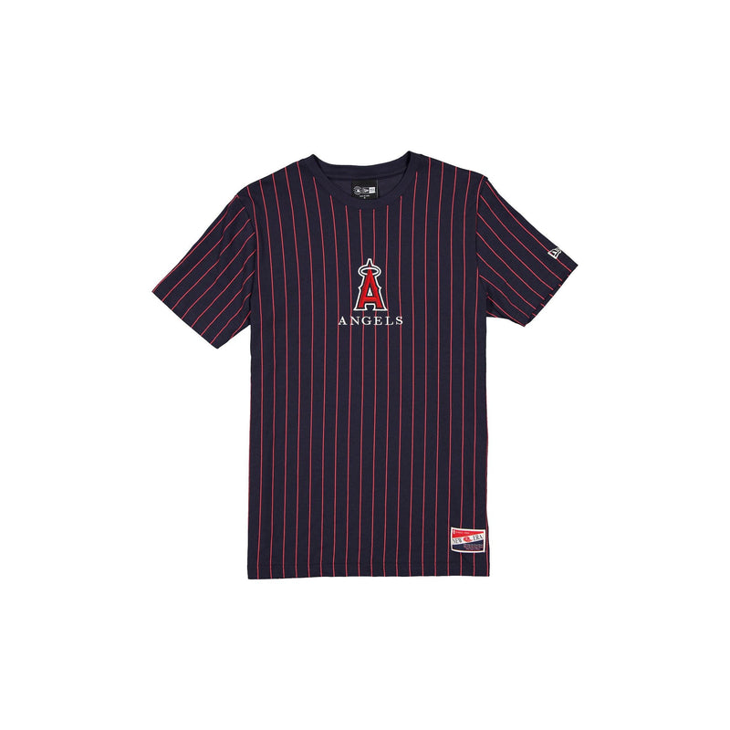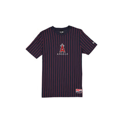 The Los Angeles Angels Throwback Pinstripe T-Shirt features an embroidered Angels logo and wordmark at the front with a New Era jock tag at the left hip.