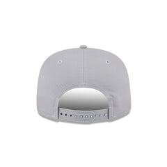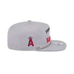 The Los Angeles Angels Vintage Gray Golfer features an embroidered 'PROPERTY OF' Angels wordmark at the front panels with a team logo at the right-wear side and a rope at the visor. Additional details include a snapback closure at the rear and a green undervisor.