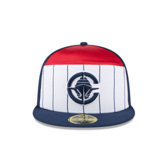 The Los Angeles Clippers 2025 Tip-Off Split Panel 59FIFTY Fitted Cap features an embroidered Clippers logo at the front panels against a pinstripe jersey fabrication with the NBA Logoman at the right-wear side. Additional details include a team wordmark at the rear and a gray undervisor.
