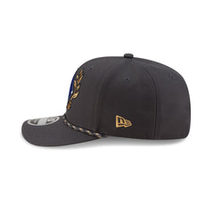 The Los Angeles Dodgers 2025 NLDS Locker Room 9SEVENTY Stretch-Snap Cap features an embroidered Dodgers logo with gold leaf accents at the front panels with a Postseason patch at the right-wear side. Additional details include a rope at the visor and the MLB Batterman logo above an adjustable stretch-snap closure at the rear.