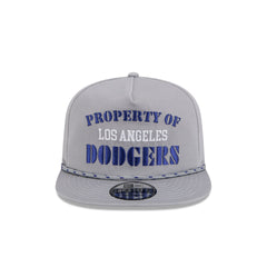 The Los Angeles Dodgers Vintage Gray Golfer features an embroidered 'PROPERTY OF' Dodgers wordmark at the front panels with a team logo at the right-wear side and a rope at the visor. Additional details include a snapback closure at the rear and a green undervisor.