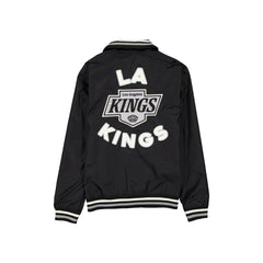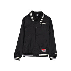 The Los Angeles Kings Throwback Jacket features an embroidered Kings helmet at the left chest with a logo and wordmark at the rear. Additional details include pockets, a button closure, and a New Era jock tag at the left hip.