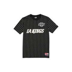 The Los Angeles Kings Throwback Pinstripe Wordmark T-Shirt features a twill applique Kings wordmark and logo at the front with a New Era jock tag at the left hip.