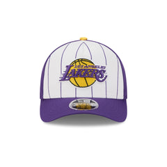 The Los Angeles Lakers 2025 Tip-Off 9FORTY M-Crown A-Frame Snapback features an embroidered Lakers logo at the front panels against a pinstripe jersey fabrication with the NBA Logoman at the right-wear side. Additional details include an adjustable snapback closure at the rear and a gray undervisor.