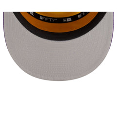 The Los Angeles Lakers 2025 Tip-Off Split Panel 9FIFTY Snapback features an embroidered Lakers logo at the front panels against a pinstripe jersey fabrication with the NBA Logoman at the right-wear side. Additional details include an adjustable snapback closure at the rear and a gray undervisor.