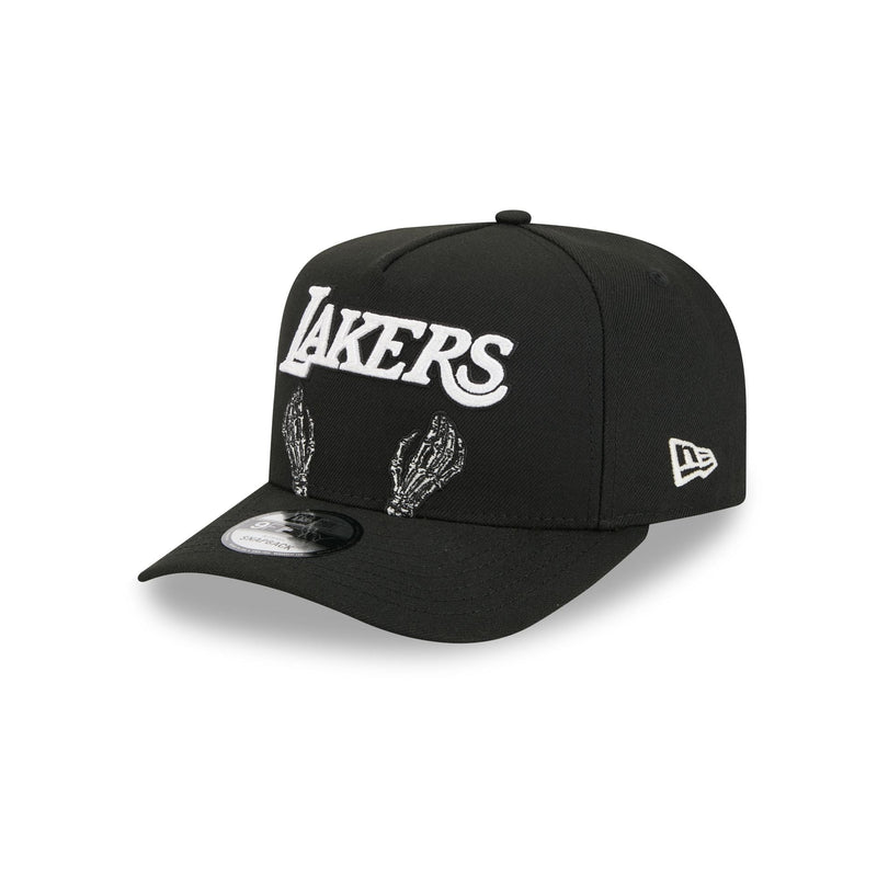 The Los Angeles Lakers Skeletal Script 9FIFTY A-Frame Snapback features a glow-in-the-dark embroidered Lakers wordmark and skeleton hands at the front with an NBA Logoman at the right of a snapback closure at the rear and a gray undervisor.