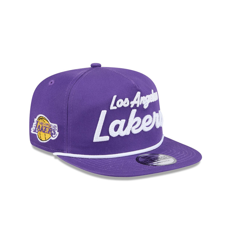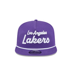 The Los Angeles Lakers Team Text Golfer features an embroidered Lakers script at the front panels with a team logo at the right-wear side and a snapback closure at the rear.