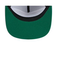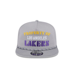 The Los Angeles Lakers Vintage Gray Golfer features an embroidered 'PROPERTY OF' Lakers wordmark at the front panels with a team logo at the right-wear side and a rope at the visor. Additional details include a snapback closure at the rear and a green undervisor.