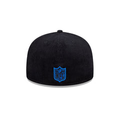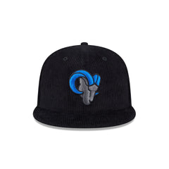 The Los Angeles Rams Color Pop Cord 59FIFTY Fitted Cap features an embroidered Rams logo at the front panels against a black corduroy fabrication throughout and a matching NFL Shield at the rear. Additional details include a black logo at the right-wear side and a blue undervisor.