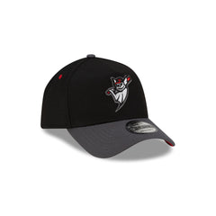 The Louisville Bats Halloween Red 9FORTY A-Frame Snapback features an embroidered Bats themed logo at the front panels with an adjustable snapback closure at the rear, a gray visor, and a red undervisor.