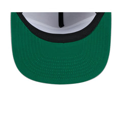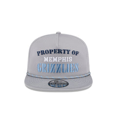 The Memphis Grizzlies Vintage Gray Golfer features an embroidered 'PROPERTY OF' Grizzlies wordmark at the front panels with a team logo at the right-wear side and a rope at the visor. Additional details include a snapback closure at the rear and a green undervisor.