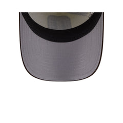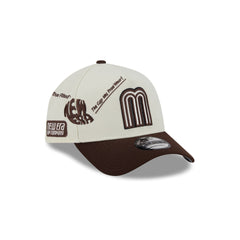 The Mexico Baseball New Era Anniversary Logos Brown Visor 9FORTY M-Crown A-Frame Snapback features an embroidered Mexico Baseball logo at the front panels with New Era Cap wordmark above a snapback closure at the rear. Additional details include New Era signature phrases and badges throughout the crown with a brown visor and a gray undervisor.