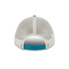 The Miami Dolphins Chrome Arch 9FORTY M-Crown A-Frame Trucker Hat features an embroidered Dolphins logo at the foam front panels with a snapback closure at a mesh rear.