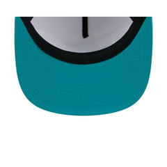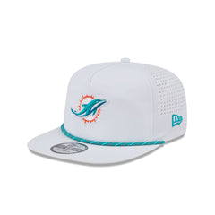 The Miami Dolphins Optic White Performance Rope Golfer features an embroidered Dolphins logo at the front panels with breathable performance fabric throughout the cap. Additional details include a city patch at the right-wear side, an adjustable drawstring closure at the rear, and a blue undervisor.