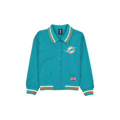 The Miami Dolphins Throwback Women's Jacket features an embroidered Dolphins logo at the left chest with a screen-printed wordmark at the rear. Additional details include front pockets, a button closure, and a New Era jock tag at the left hip.