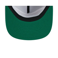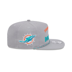 The Miami Dolphins Vintage Gray Golfer features an embroidered 'PROPERTY OF' Dolphins wordmark at the front panels with a team logo at the right-wear side and a rope at the visor. Additional details include a snapback closure at the rear and a green undervisor.