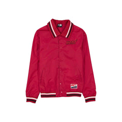 The Miami Heat Throwback Jacket features an embroidered Heat logo at the left chest with a logo and wordmark at the rear. Additional details include pockets, a button closure, and a New Era jock tag at the left hip.