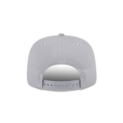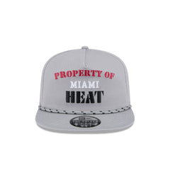 The Miami Heat Vintage Gray Golfer features an embroidered 'PROPERTY OF' Heat wordmark at the front panels with a team logo at the right-wear side and a rope at the visor. Additional details include a snapback closure at the rear and a green undervisor.