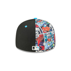 The Miami Marlins Diamond Hero Edition Low Profile 59FIFTY Fitted Cap features an embroidered Marlins onomatopoeia pop logo at the front panels with baseball comic book prints at the front and back panel. Additional details include the MLB Batterman logo at the rear and a gray undervisor. This cap comes with a pre-curved visor.