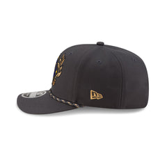 The Milwaukee Brewers 2025 NLDS Locker Room 9SEVENTY Stretch-Snap Cap features an embroidered Brewers logo with gold leaf accents at the front panels with a Postseason patch at the right-wear side. Additional details include a rope at the visor and the MLB Batterman logo above an adjustable stretch-snap closure at the rear.