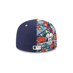 The Milwaukee Brewers Diamond Hero Edition 59FIFTY Fitted Cap features an embroidered Brewers onomatopoeia pop logo at the front panels with baseball comic book prints at the front and back panel. Additional details include the MLB Batterman logo at the rear and a gray undervisor.