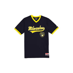 The Milwaukee Brewers Throwback Team T-Shirt features a screen-printed Brewers wordmark and embroidered team logo at the front with a New Era jock tag at the left hip. This t-shirt has a v-neckline.