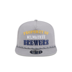 The Milwaukee Brewers Vintage Gray Golfer features an embroidered 'PROPERTY OF' Brewers wordmark at the front panels with a team logo at the right-wear side and a rope at the visor. Additional details include a snapback closure at the rear and a green undervisor.