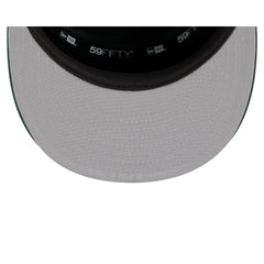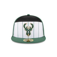 The Milwaukee Bucks 2025 Tip-Off Split Panel 59FIFTY Fitted Cap features an embroidered Bucks logo at the front panels against a pinstripe jersey fabrication with the NBA Logoman at the right-wear side. Additional details include a team wordmark at the rear and a gray undervisor.