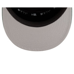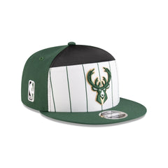 The Milwaukee Bucks 2025 Tip-Off Split Panel 9FIFTY Snapback features an embroidered Bucks logo at the front panels against a pinstripe jersey fabrication with the NBA Logoman at the right-wear side. Additional details include an adjustable snapback closure at the rear and a gray undervisor.