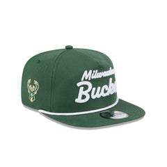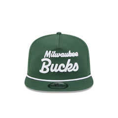The Milwaukee Bucks Team Text Golfer features an embroidered Bucks script at the front panels with a team logo at the right-wear side and a snapback closure at the rear.