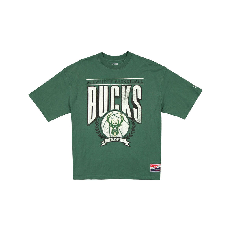The Milwaukee Bucks Throwback Boxy T-Shirt features a screen-printed Bucks graphic at the front and a New Era jock tag at the left hip.