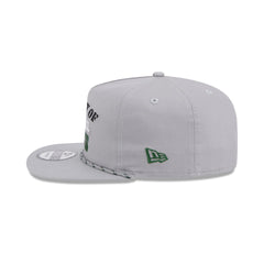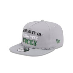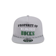 The Milwaukee Bucks Vintage Gray Golfer features an embroidered 'PROPERTY OF' Bucks wordmark at the front panels with a team logo at the right-wear side and a rope at the visor. Additional details include a snapback closure at the rear and a green undervisor.