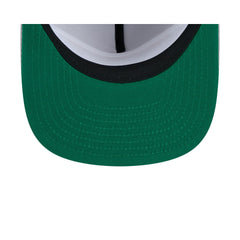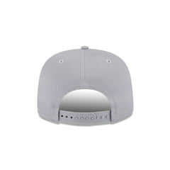 The Minnesota Vikings Vintage Gray Golfer features an embroidered 'PROPERTY OF' Vikings wordmark at the front panels with a team logo at the right-wear side and a rope at the visor. Additional details include a snapback closure at the rear and a green undervisor.