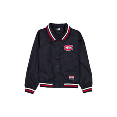 The Montreal Canadiens Throwback Women's Jacket features an embroidered Canadiens logo at the left chest with a screen-printed wordmark at the rear. Additional details include front pockets, a button closure, and a New Era jock tag at the left hip.