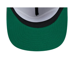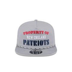 The New England Patriots Vintage Gray Golfer features an embroidered 'PROPERTY OF' Patriots wordmark at the front panels with a team logo at the right-wear side and a rope at the visor. Additional details include a snapback closure at the rear and a green undervisor.