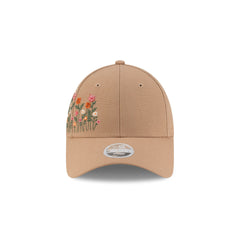 The New Era Cap Women's Floral Brown 9FORTY Snapback features embroidered flowers at the right-wear side and an adjustable D-Ring closure at the rear.