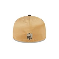 The New Orleans Saints Spring Satin 59FIFTY Fitted Cap features an embroidered Saints wordmark at the front panels with a New Era pin at the top left panel and an NFL Shield logo at the rear. Additional details include a satin fabrication throughout, a logo at the right-wear side, and a green undervisor.