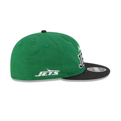 The New York Jets International Games Series Historic Retro Crown 9FIFTY Snapback features an embroidered Jets wordmark at the front panels with a historic logo at the right wear side and an adjustable snapback closure at the rear.