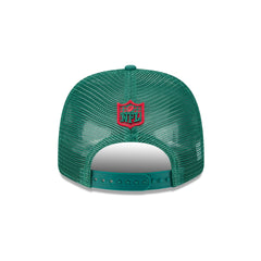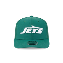The New York Jets Team 9SEVENTY Trucker features an embroidered Jets logo at the front panels with a matching NFL Shield logo above an adjustable snapback closure at a mesh rear and a gray undervisor.