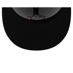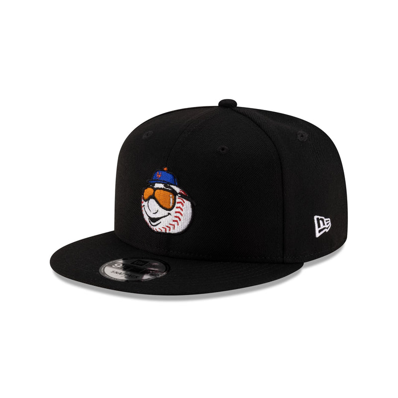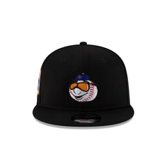 The New York Mets Mr. Met Black 9FIFTY Snapback features an embroidered Mets Mr. Met mascot at the front panels with a 2025 Florida Spring Training patch at the right-wear side and a snapback closure at the rear.