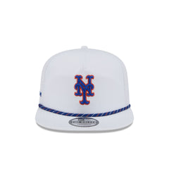 The New York Mets Optic White Performance Rope Golfer features an embroidered Mets logo at the front panels with breathable performance fabric throughout the cap. Additional details include a city patch at the right-wear side, an adjustable drawstring closure at the rear, and a blue undervisor.