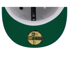 The New York Mets Spring Satin 59FIFTY Fitted Cap features an embroidered Mets wordmark at the front panels with a New Era pin at the top left panel and an MLB Batterman logo at the rear. Additional details include a satin fabrication throughout, a logo at the right-wear side, and a green undervisor.