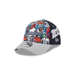 The New York Yankees Diamond Hero Edition 9FORTY A-Frame Snapback features an embroidered Yankees onomatopoeia pop wordmark at the front panels with baseball comic book prints at the front and back panel. Additional details include a ZOOM! wordmark at the left-wear side, the MLB Batterman logo above a snapback closure at the rear, and a black undervisor.
