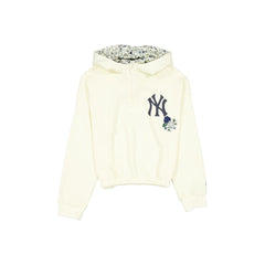 The New York Yankees Glam Game Women's Hoodie features a screen-printed Yankees logo at the left chest with matching embroidered flowers. Additional details include a zipper closure and a floral lining.