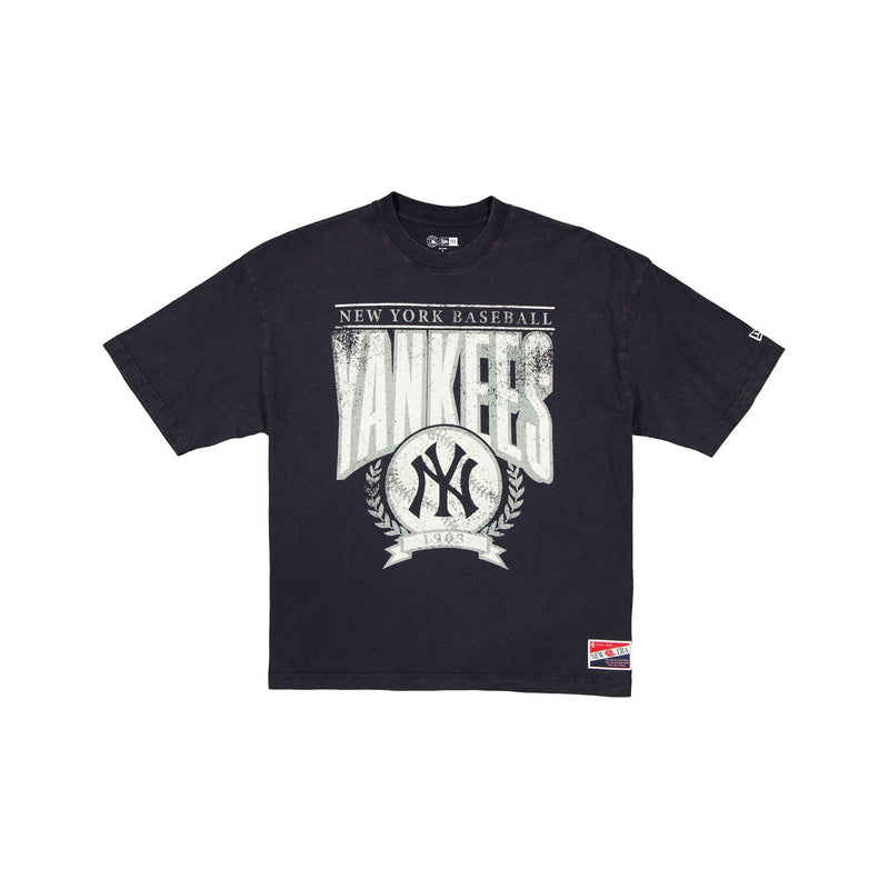The New York Yankees Throwback Boxy T-Shirt features a screen-printed Yankees graphic at the front and a New Era jock tag at the left hip.