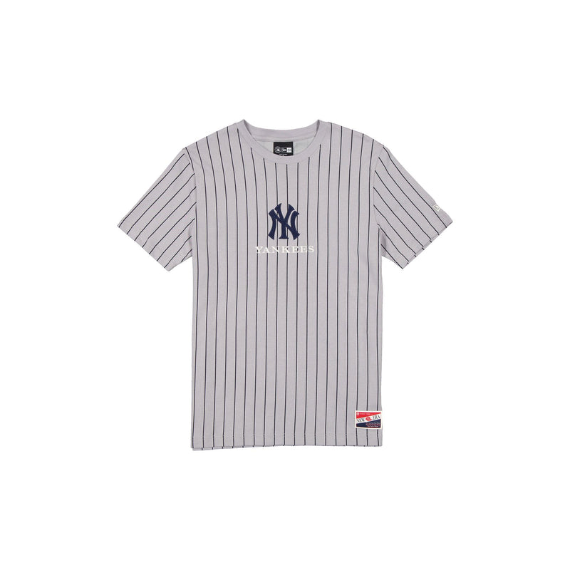 The New York Yankees Throwback Pinstripe T-Shirt features an embroidered Yankees logo and wordmark at the front with a New Era jock tag at the left hip.