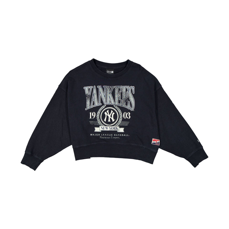 The New York Yankees Throwback Women's Crewneck features a screen-printed Yankees graphic at the front and a New Era jock tag at the left hip.