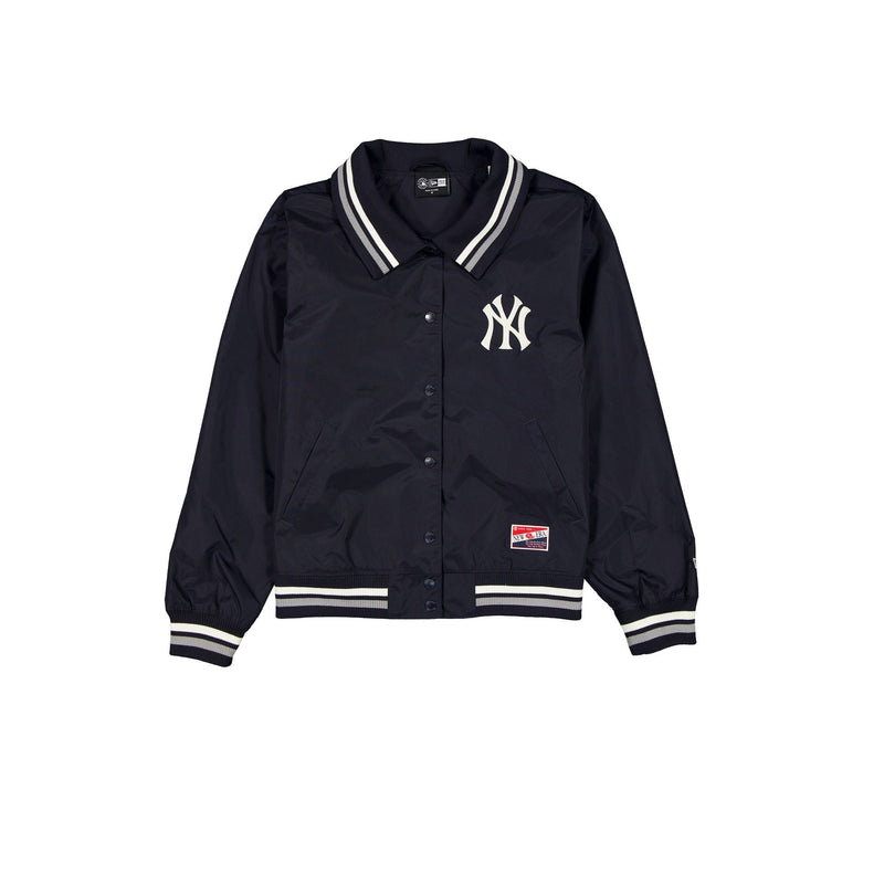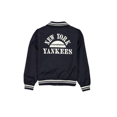 The New York Yankees Throwback Women's Jacket features an embroidered Yankees logo at the left chest with a screen-printed wordmark at the rear. Additional details include front pockets, a button closure, and a New Era jock tag at the left hip.