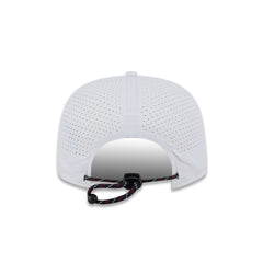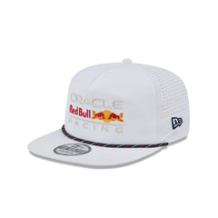The Oracle Red Bull Racing Optic White Performance Rope Golfer features an embroidered Oracle Red Bull Racing logo at the front panels with breathable performance fabric throughout the cap. Additional details include a team patch at the right-wear side, an adjustable drawstring closure at the rear, and a black undervisor.