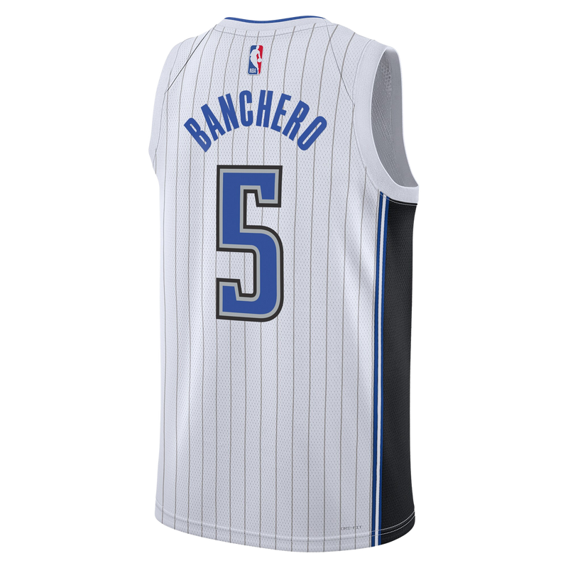 Banchero's #5 pops with a clean outline, embodying the precision and versatility of his game. Complete with dark contrast side panels, this Association Edition is the official look for every true Magic fan. It’s timeless style built for a generational talent. Shop the Paolo Banchero White Association Edition now!
